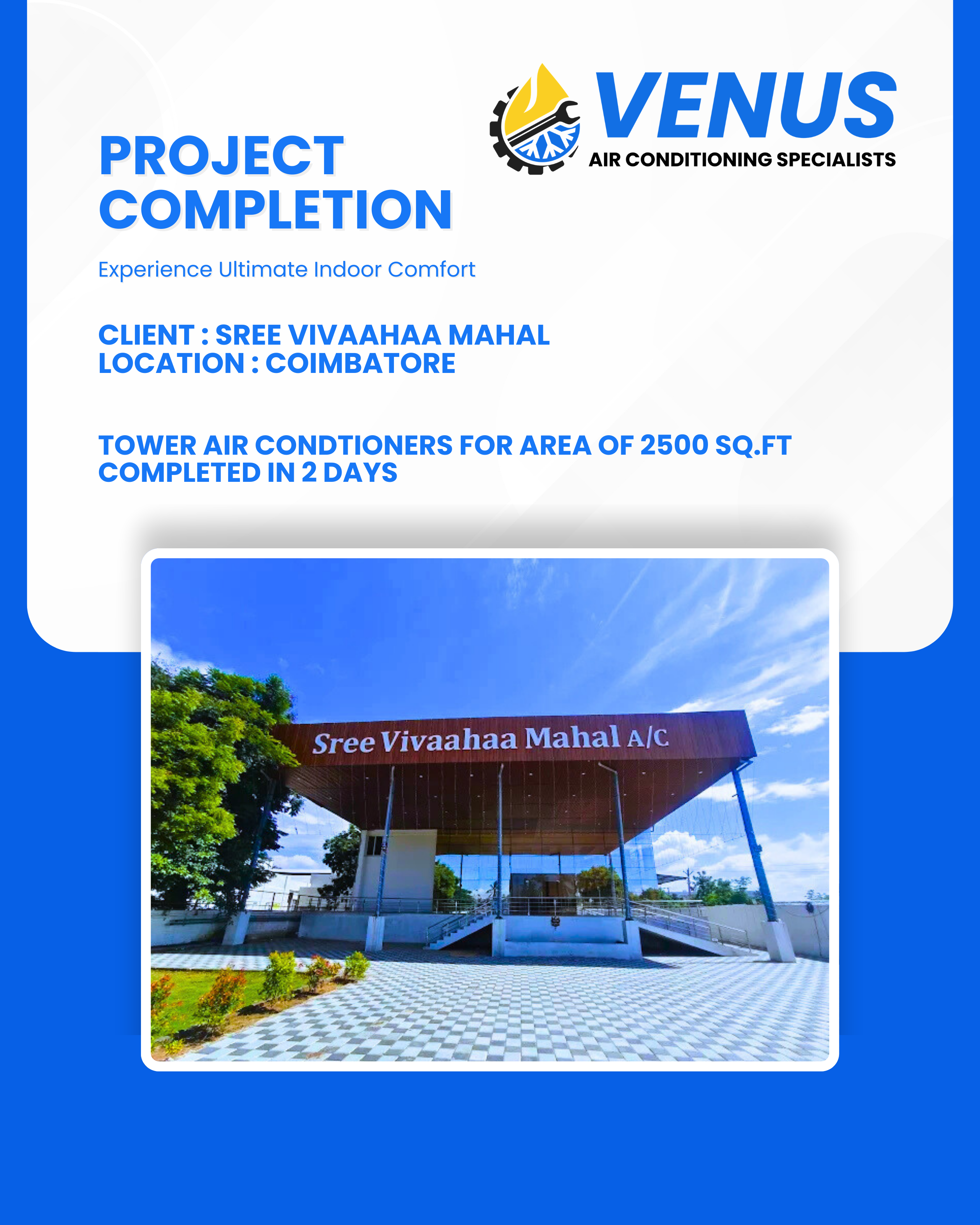 Venus Air Conditioning Specialists successfully completed a commercial cooling installation for Sree Vivaahaa Mahal in Coimbatore, delivering an efficient air conditioning solution for a high-capacity event space.